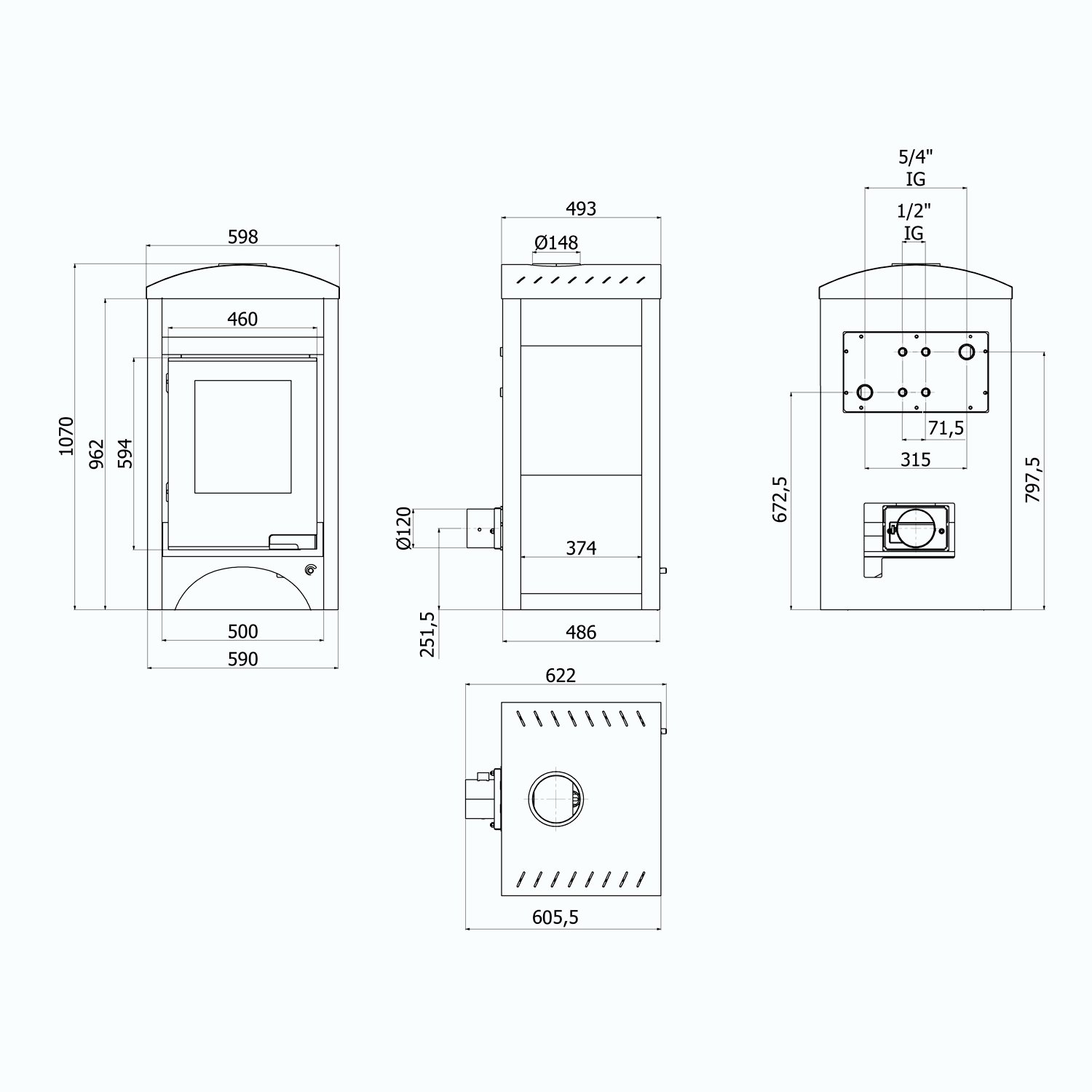 Rauchrohranschluss: 150 mm (oben)