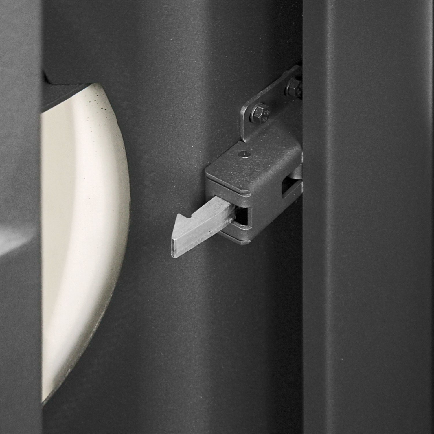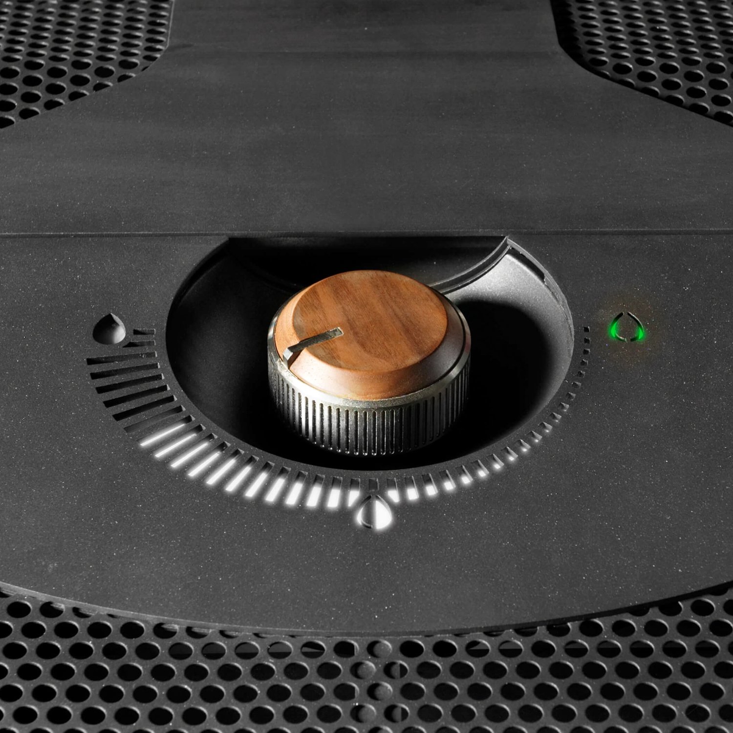 Türgriff und Drehregler bestehen aus edlem Nussholz – ein stilvoller Kontrast zum robusten Stahlkorpus.