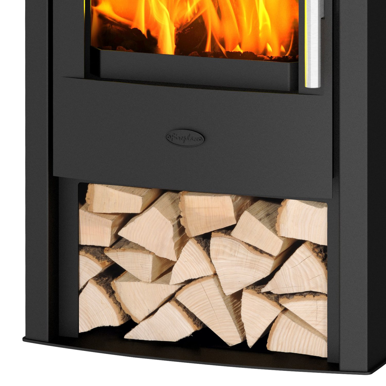 Unterhalb des Brennraums befindet sich ein offenes Holzfach, das eine praktische und griffbereite Lagerung von Brennholz ermöglicht.