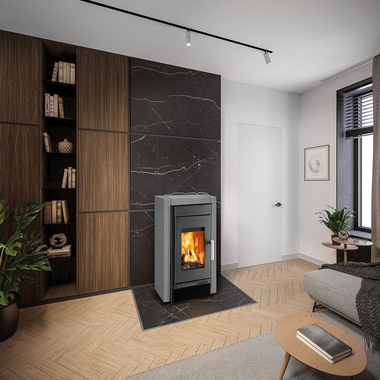 Die Natursteinverkleidungen Woodstone und Quarzit Grau verleihen dem Kaminofen nicht nur ein einzigartiges Erscheinungsbild, sondern sorgen zusätzlich für eine langlebige Wärmespeicherung und eine ruhige, moderne Ästhetik.