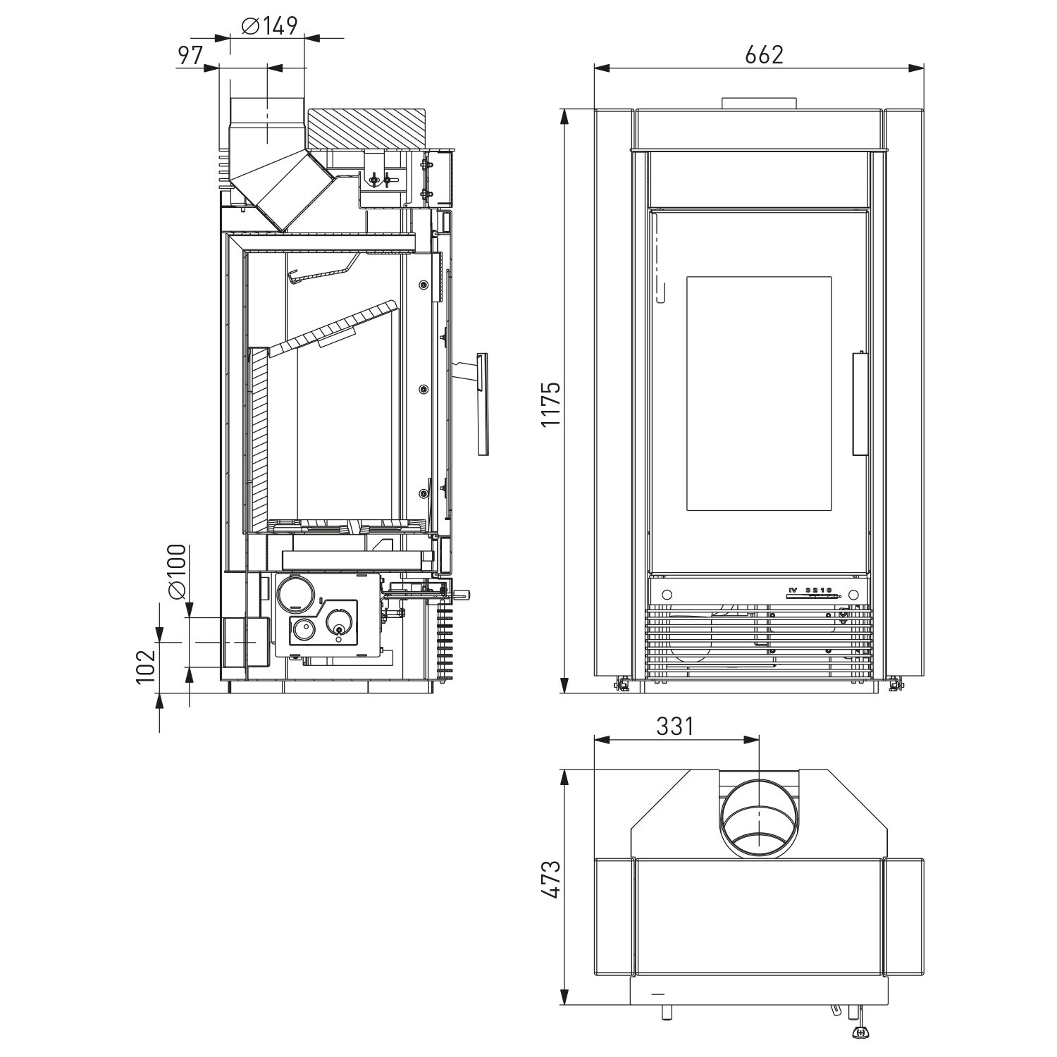 Rauchrohranschluss: Ø 150 mm (oben)