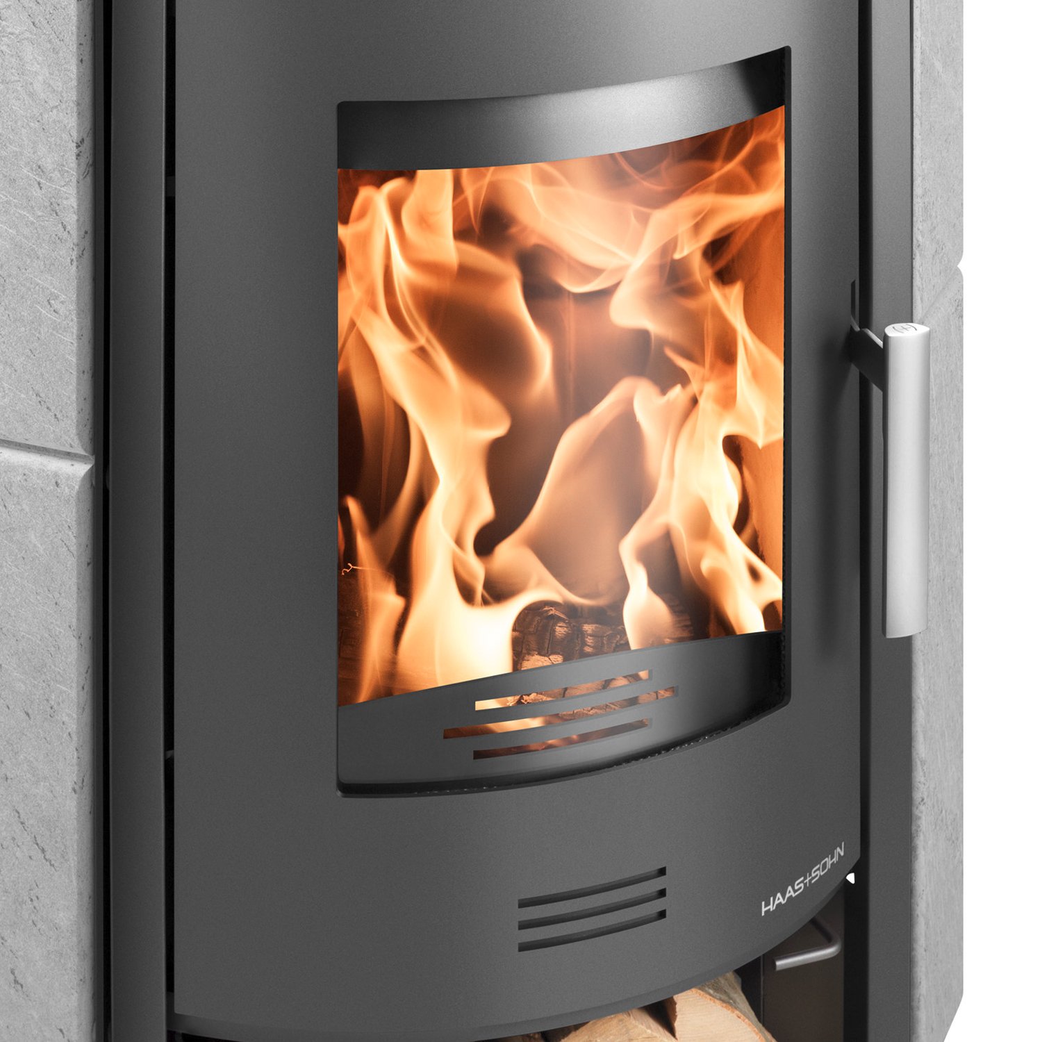 Die gewölbte Tür und die Scheibenspülung sorgen stets für freie Sicht auf das Flammenspiel.
