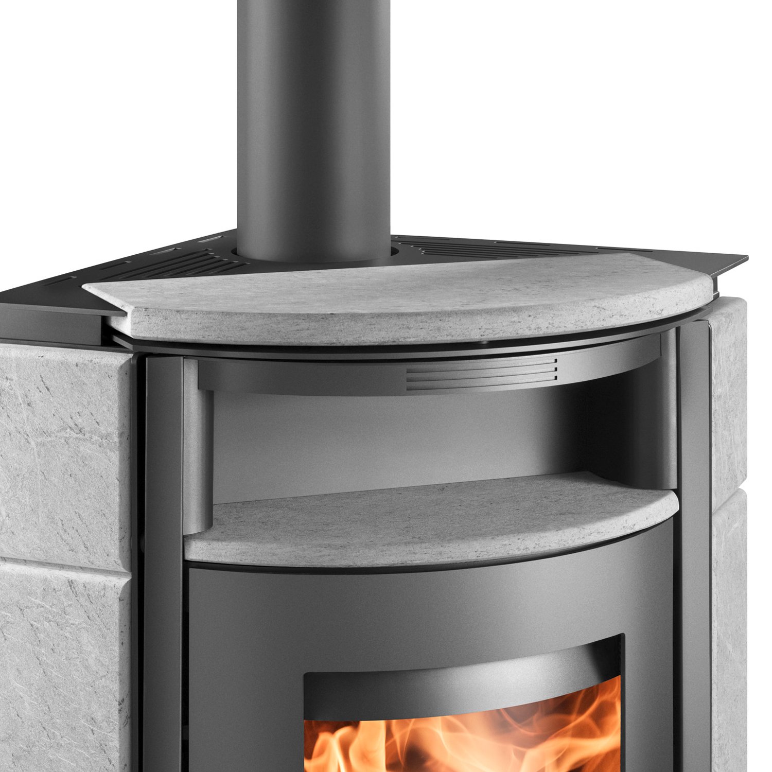 Die hochwertige Natursteinverkleidung in den Varianten Woodstone, Quarzit oder Serpentino macht den Kuopio II nicht nur optisch zum Blickfang, sondern sorgt auch für anhaltende Wärmespeicherung. Der anthrazitfarbene Stahlkorpus fügt sich harmonisch in moderne und klassische Wohnstile ein.