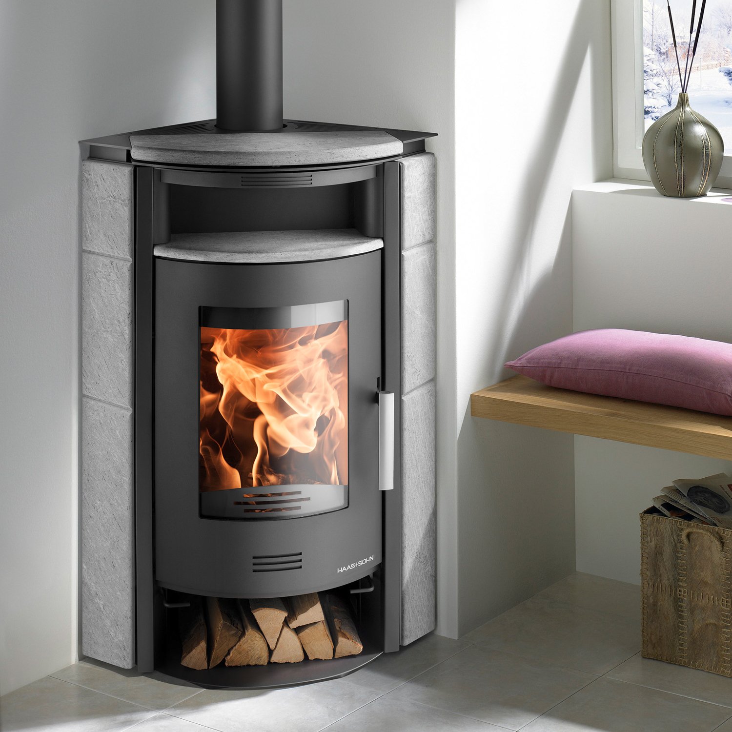 Haas+Sohn Kuopio II Kaminofen – 8 kW, Eckaufstellung, Naturstein, automatische Luftregelung, Bauart 1
