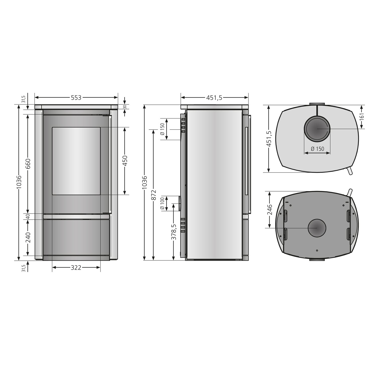 Rauchrohranschluss: 150 mm (oben/hinten)