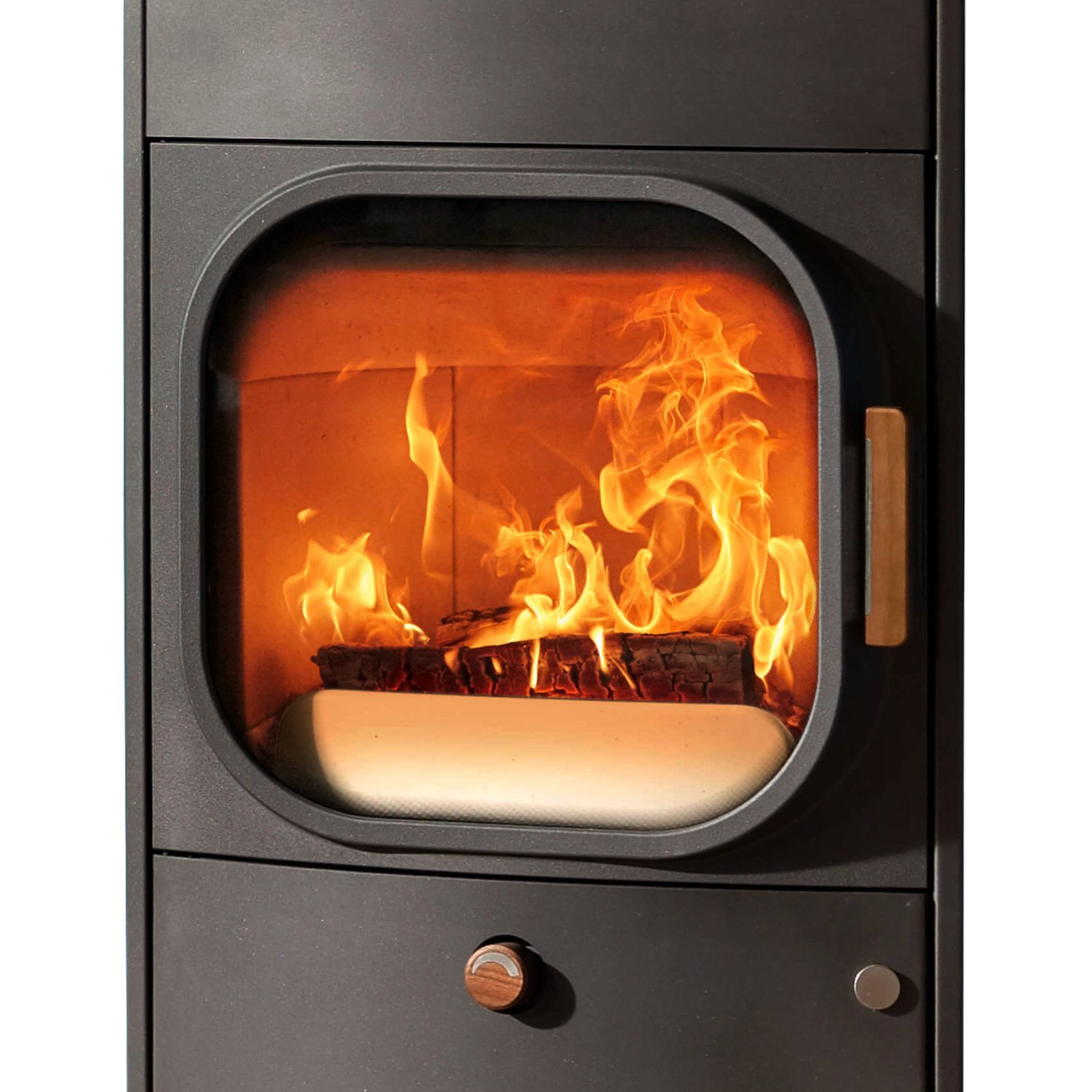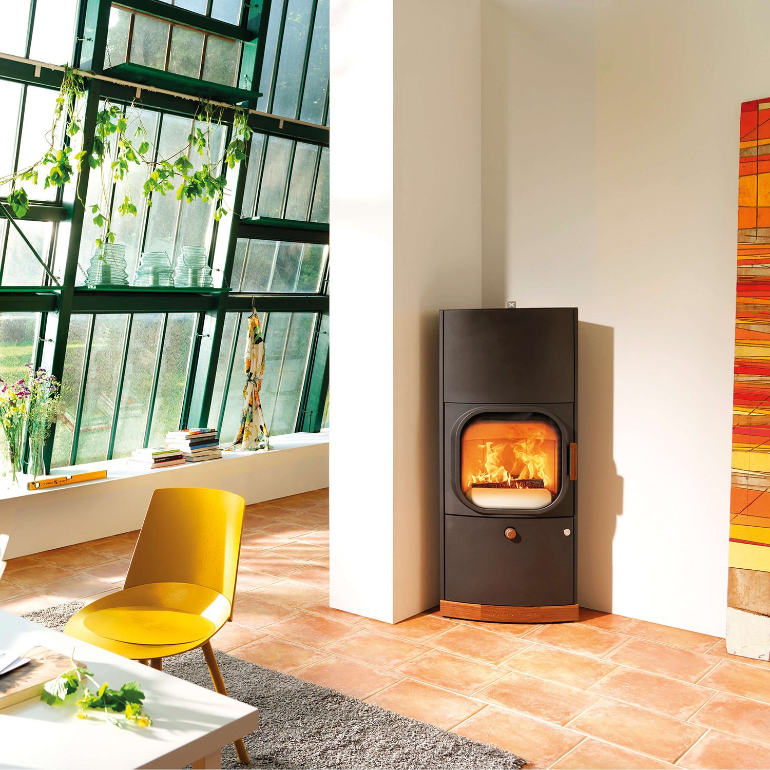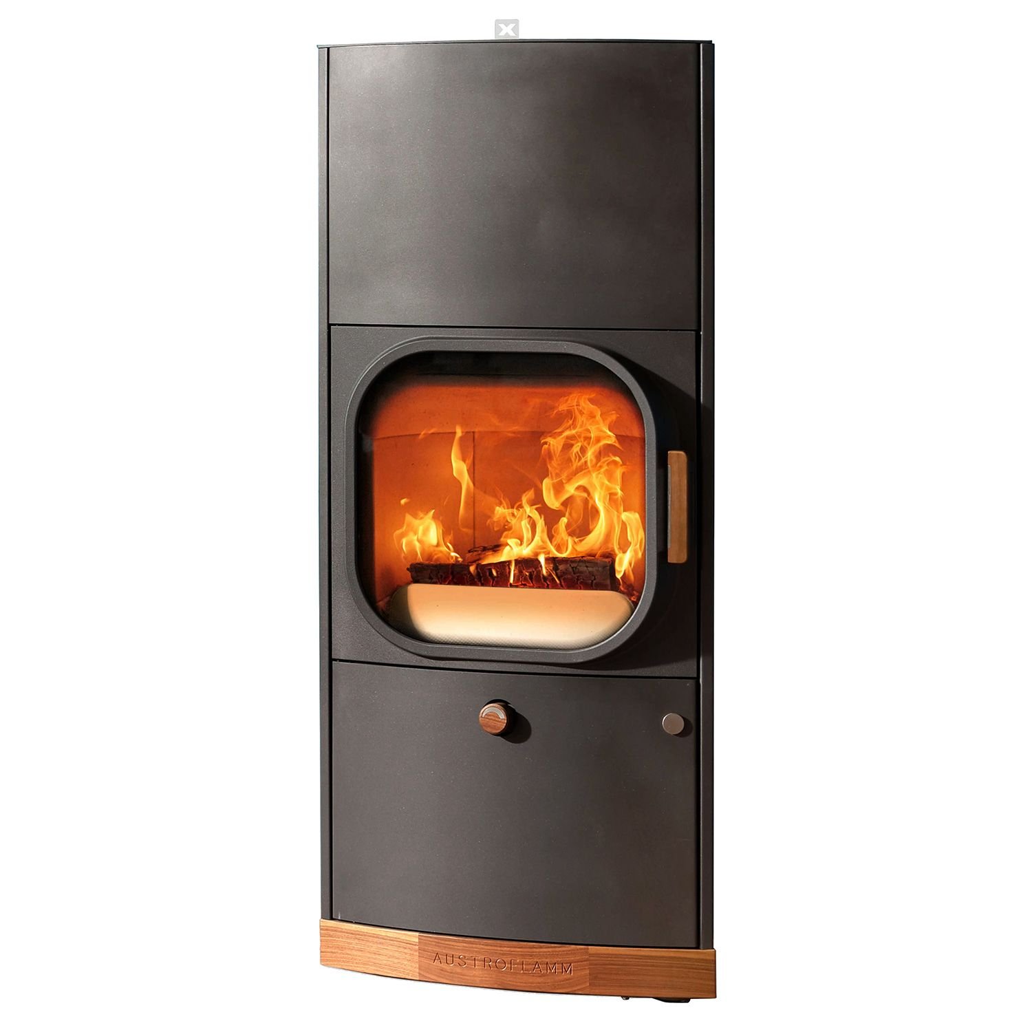 Sein markantes, nach hinten verjüngtes Design macht ihn zur idealen Lösung für Ecken und moderne Wohnräume. Der schwarze Stahlkorpus wird durch edle Holzelemente an Griff, Luftregler und Sockel ergänzt – ein zeitloses Stilmerkmal von Austroflamm.