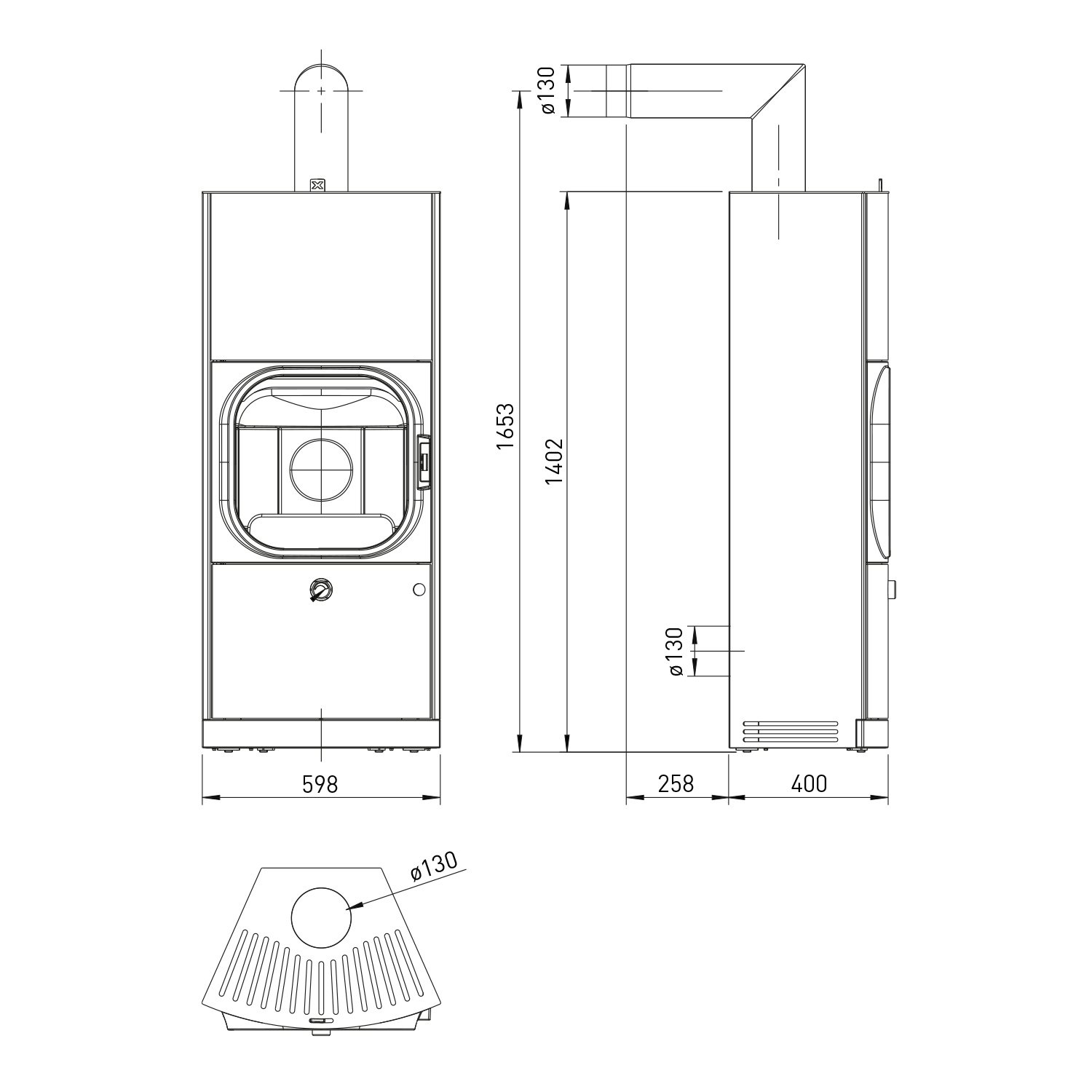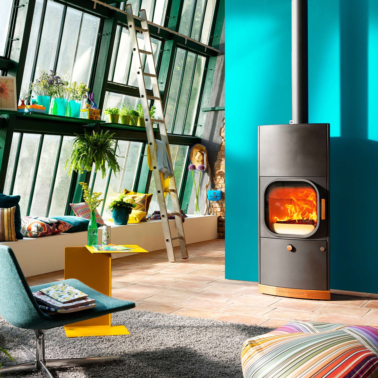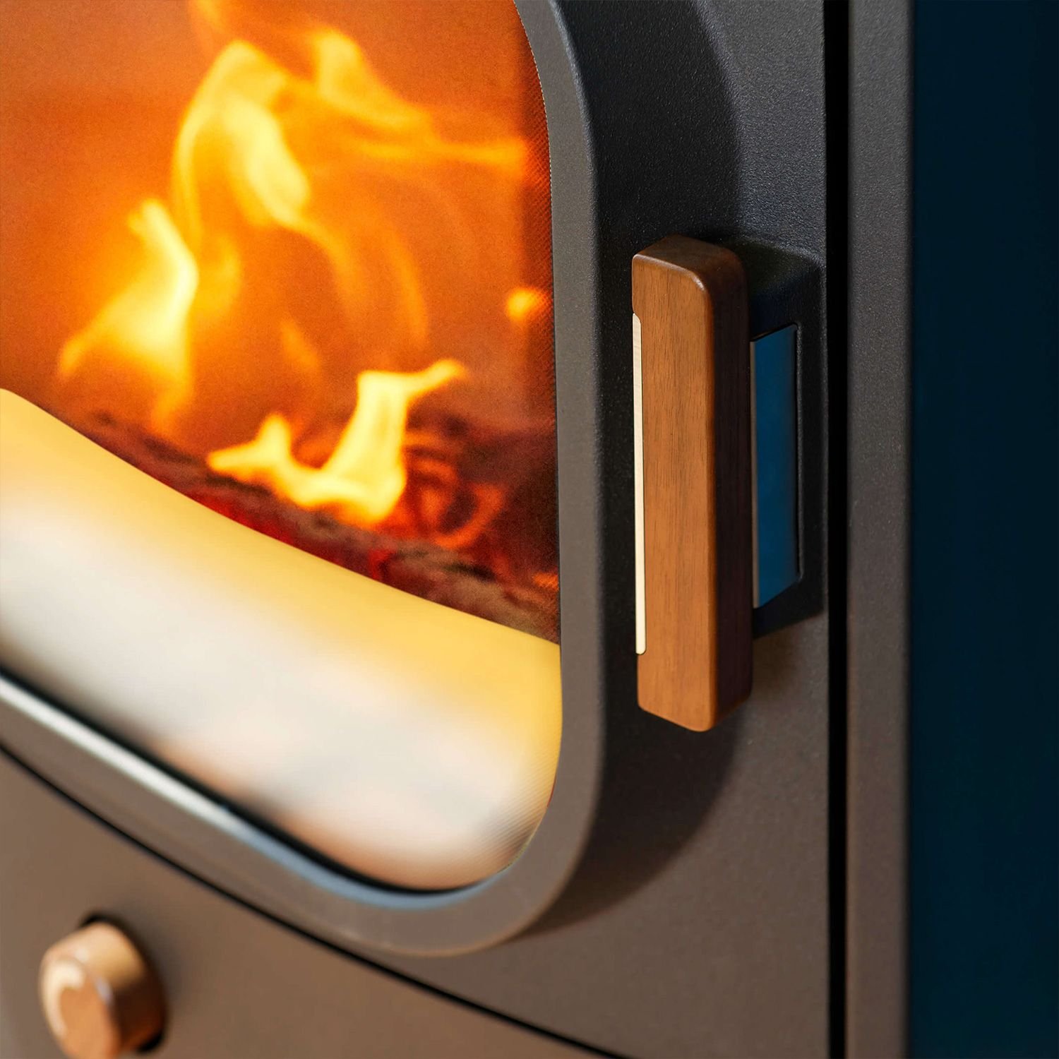 Sein markantes, nach hinten verjüngtes Design macht ihn zur idealen Lösung für Ecken und moderne Wohnräume. Der schwarze Stahlkorpus wird durch edle Holzelemente an Griff, Luftregler und Sockel ergänzt – ein zeitloses Stilmerkmal von Austroflamm.
