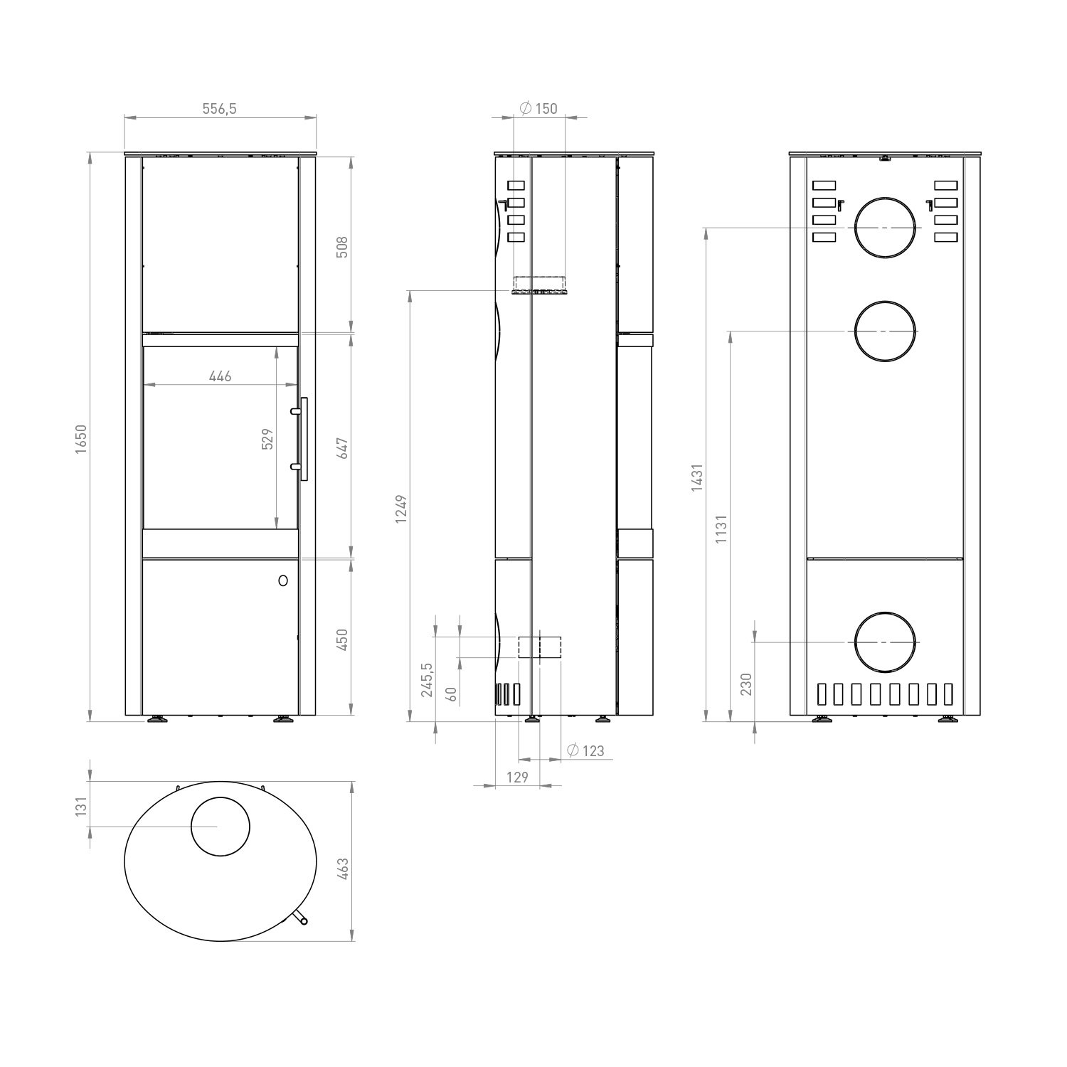 Ø Rauchrohranschluss: 150 mm (oben / hinten)