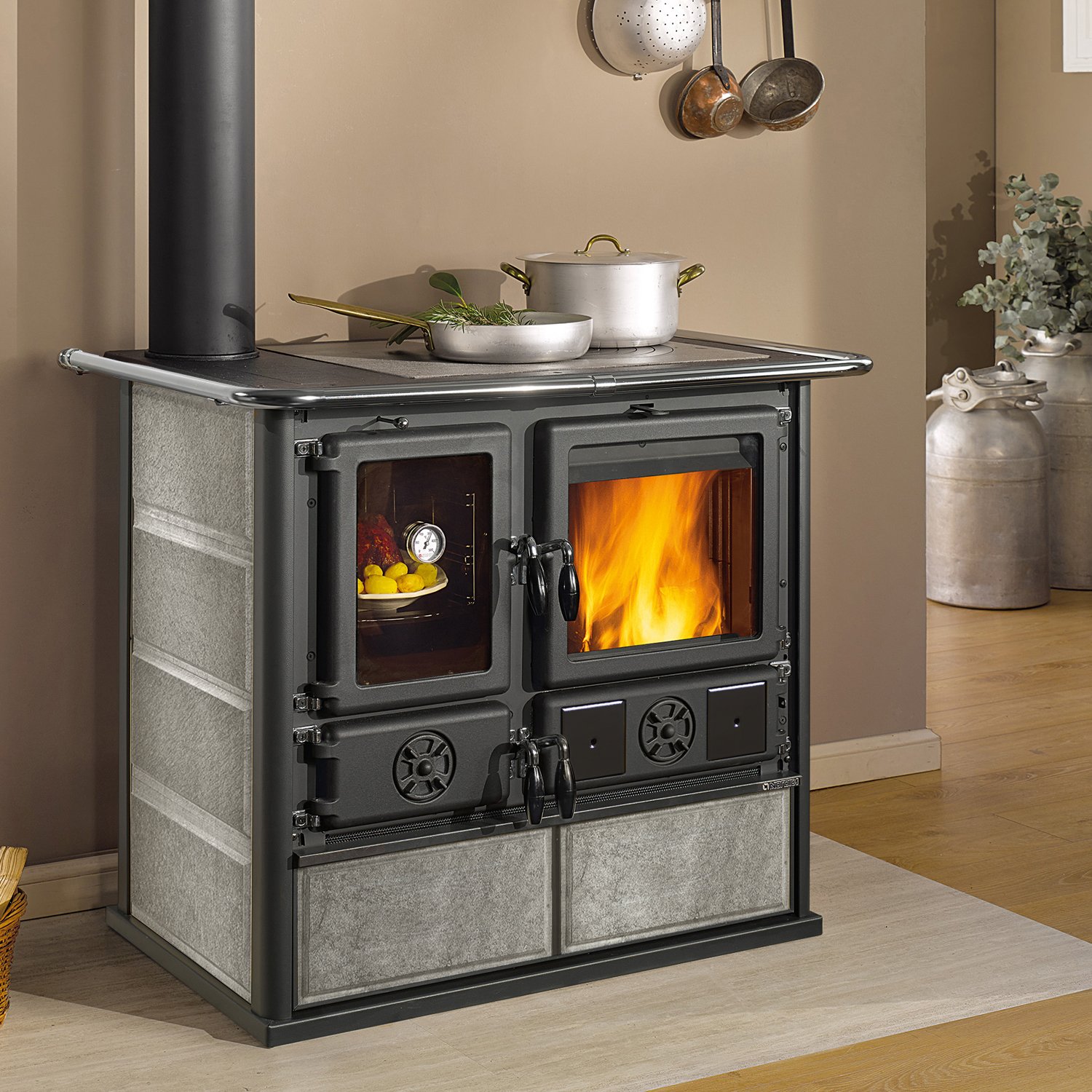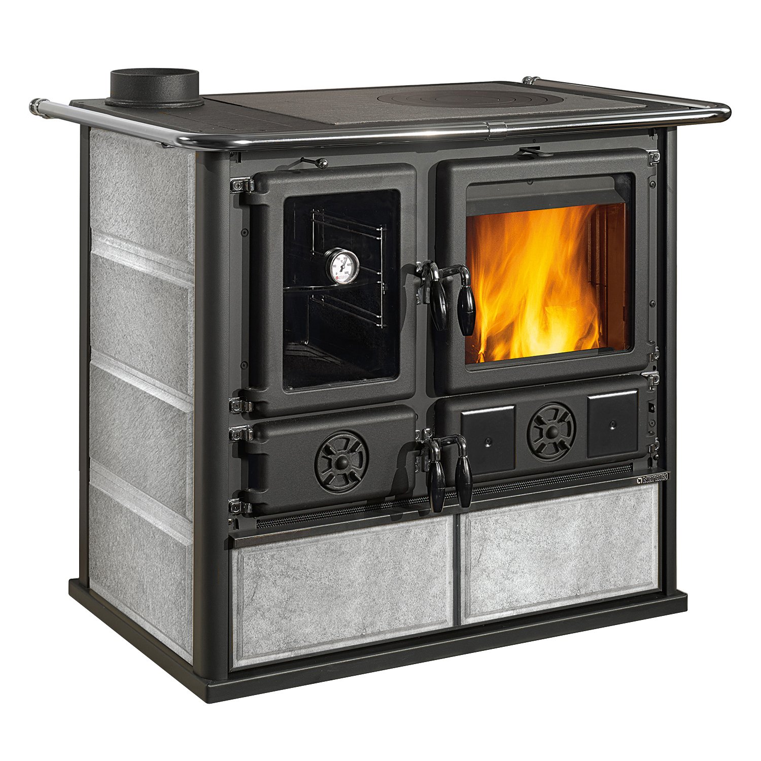 Der La Nordica Rosa Reverse Sinistra ist ein hochwertiger italienischer Küchenofen, der traditionelles Kochen und effizientes Heizen perfekt miteinander verbindet. Die Bezeichnung Sinistra bedeutet links – entsprechend befindet sich das Backfach auf der linken Seite, während der Brennraum rechts angeordnet ist. Die großzügige Kochplatte, das integrierte Thermometer und das Warmhaltefach unter dem Backraum ermöglichen ein vollwertiges Kocherlebnis – vollkommen unabhängig von Strom, Gas oder Öl.
