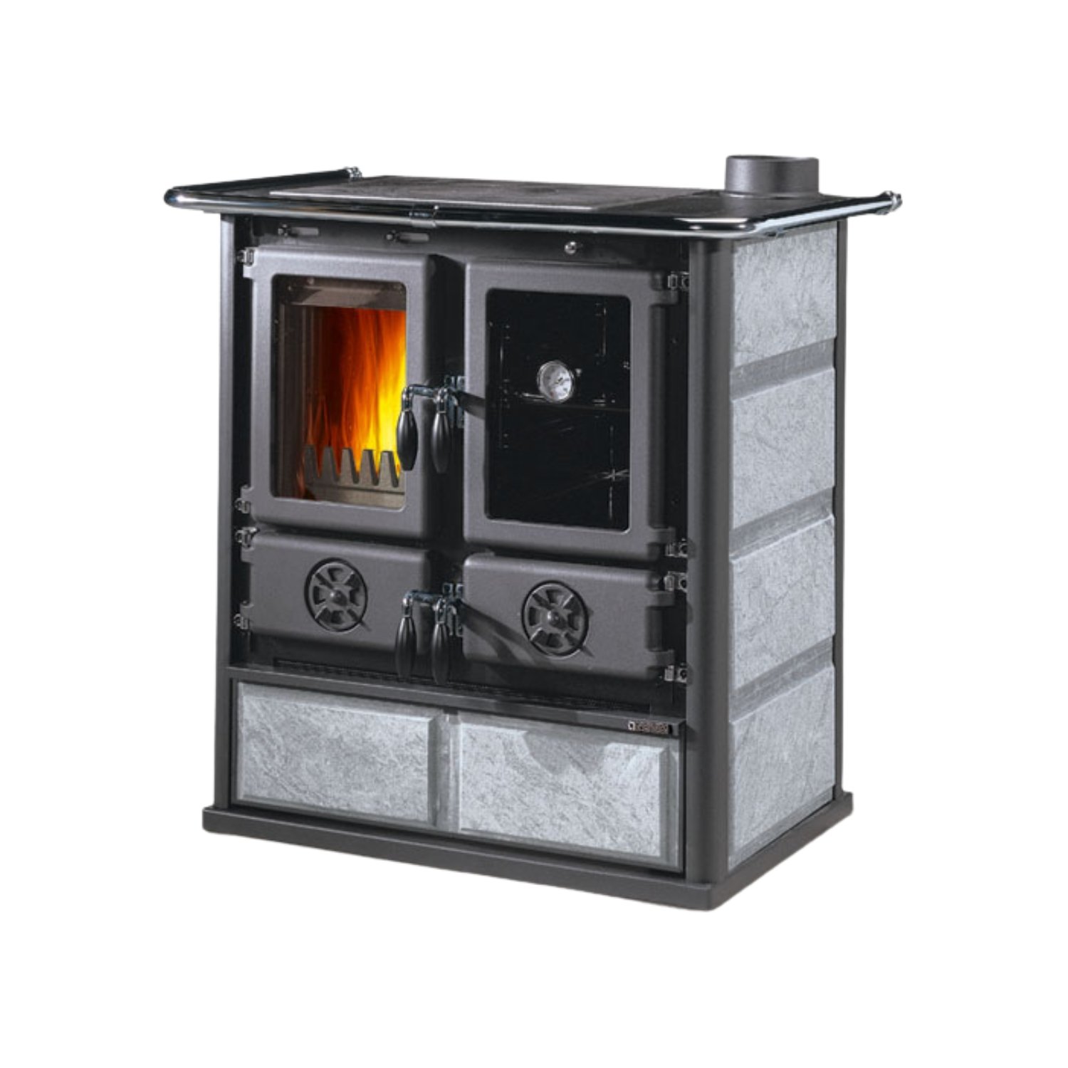 Mit dem integrierten Thermometer in der Backofentür haben Sie die Temperatur stets im Blick. Eine Kochplatte und eine zusätzliche Aussparung für ein Wasserschiff ermöglichen flexible Zubereitungsmöglichkeiten – völlig unabhängig von Strom, Gas oder Öl.