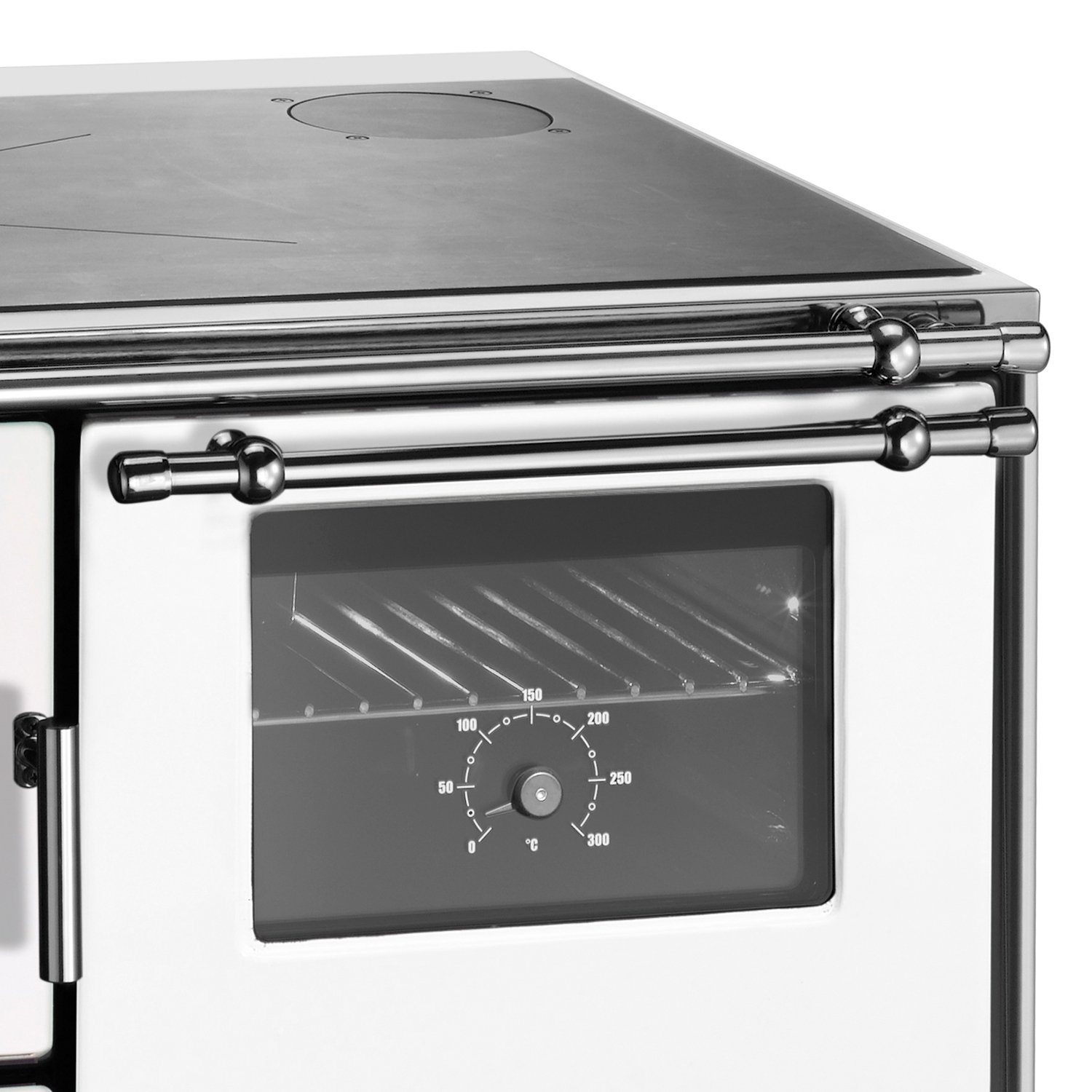 Das großzügige, doppelverglaste Backfach ist mit einem integrierten Thermometer ausgestattet, sodass Sie jederzeit die Backtemperatur im Blick behalten. Durch das große Sichtfenster in der Brennraumtür genießen Sie zudem das gemütliche Flammenspiel – ein echter Blickfang in jeder Küche.
