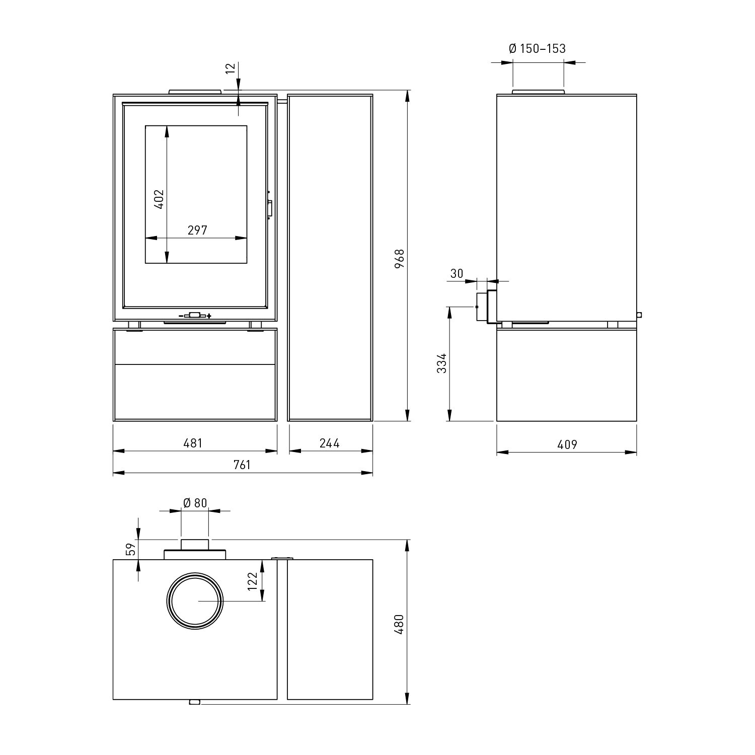 Rauchrohranschluss: 150 mm (oben)