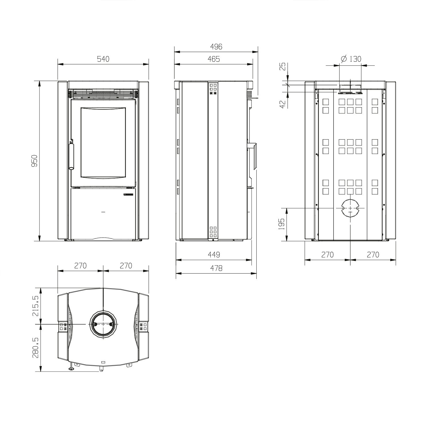 Rauchrohranschluss: 130 mm (oben)