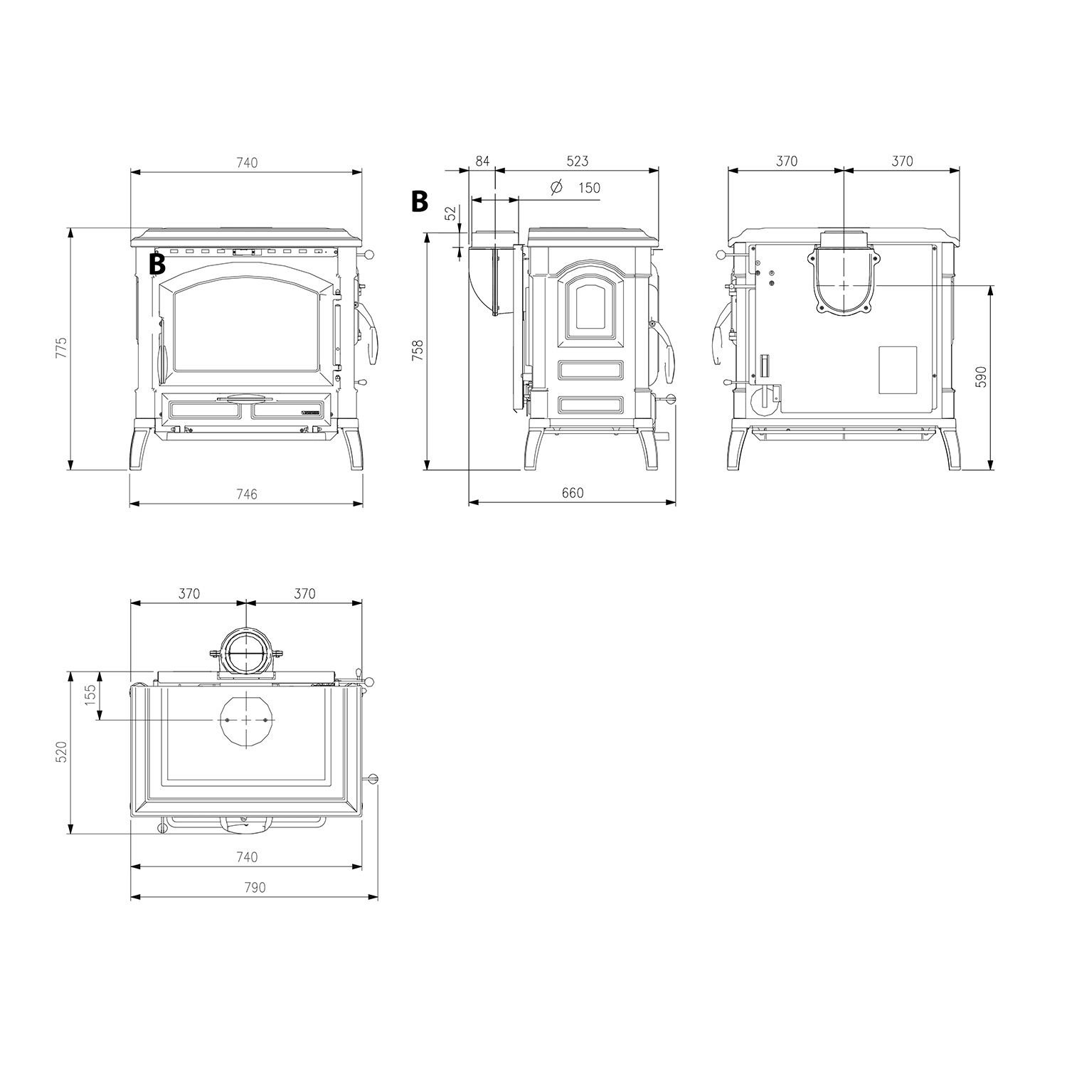 Der Rauchrohranschluss (Ø 150 mm) kann hinten angebracht werden. Durch seine robuste Bauweise und den fest installierten Aschekasten ist der Ofen besonders wartungsfreundlich.