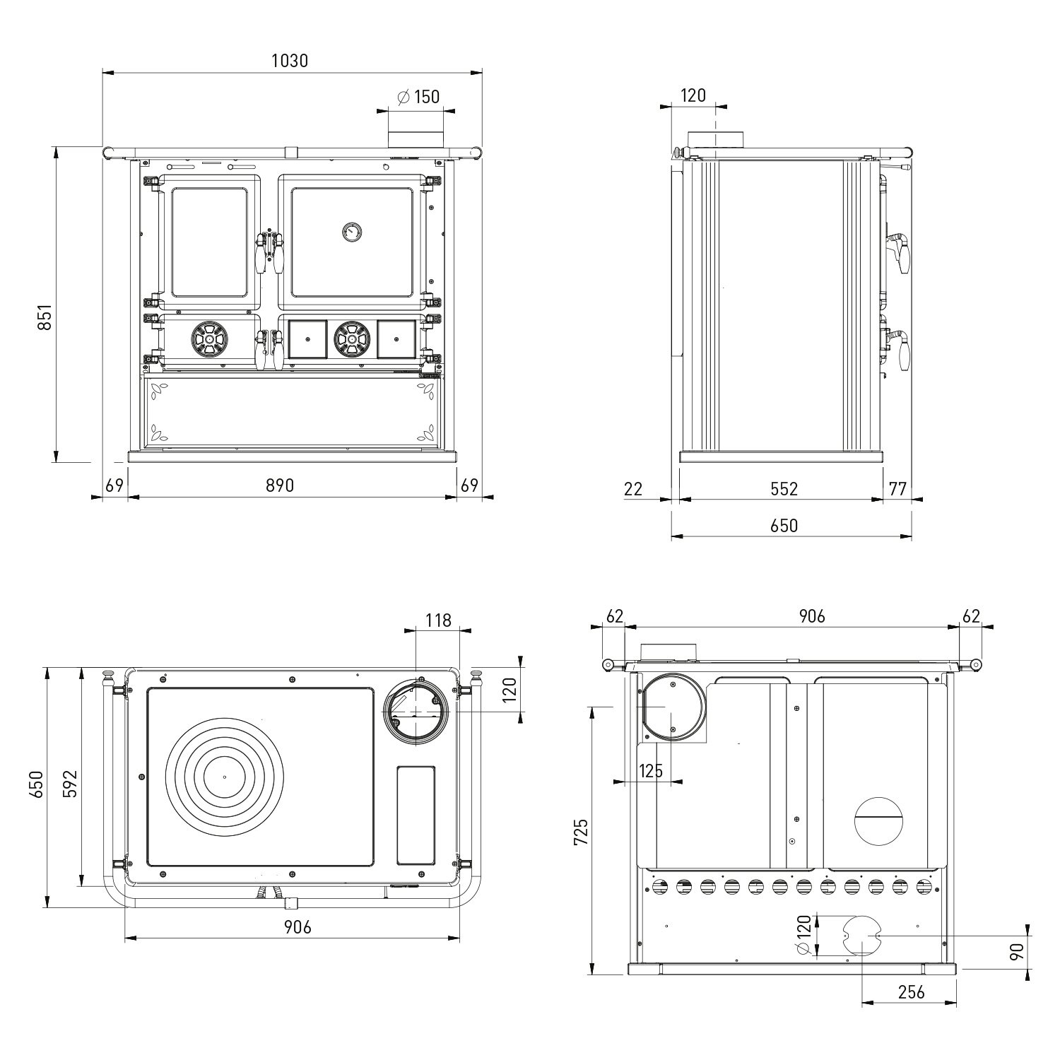 Der Küchenofen verbrennt Holzscheite bis 30 cm Länge oder Holzbriketts.