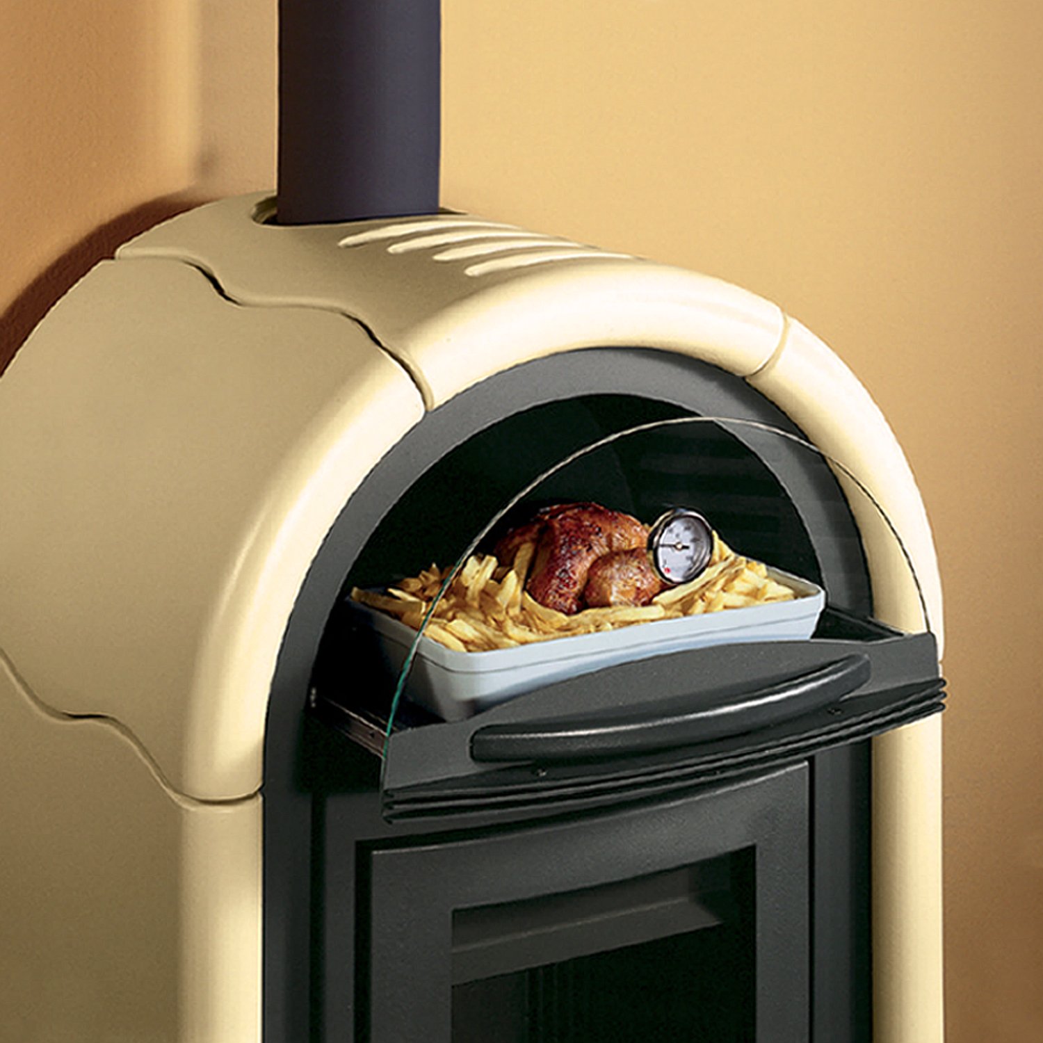 Das emaillierte, ausziehbare Backfach ermöglicht das komfortable Zubereiten von Speisen – wie in einem traditionellen Holzofen.