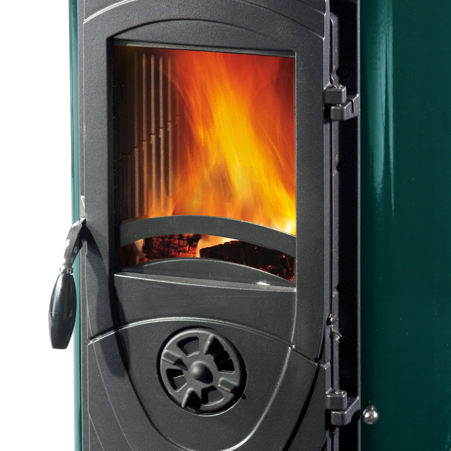 Die robuste emaillierte Stahlverkleidung (hier in stilvollem Grün) sowie der langlebige Brennraum und die Tür aus Gusseisen sorgen für hohe Stabilität und optimale Wärmespeicherung. Die integrierte emaillierte Gusseisen-Kochplatte ermöglicht es, Speisen zu erwärmen oder zu kochen – perfekt für gemütliche Abende oder stromsparende Nutzung.