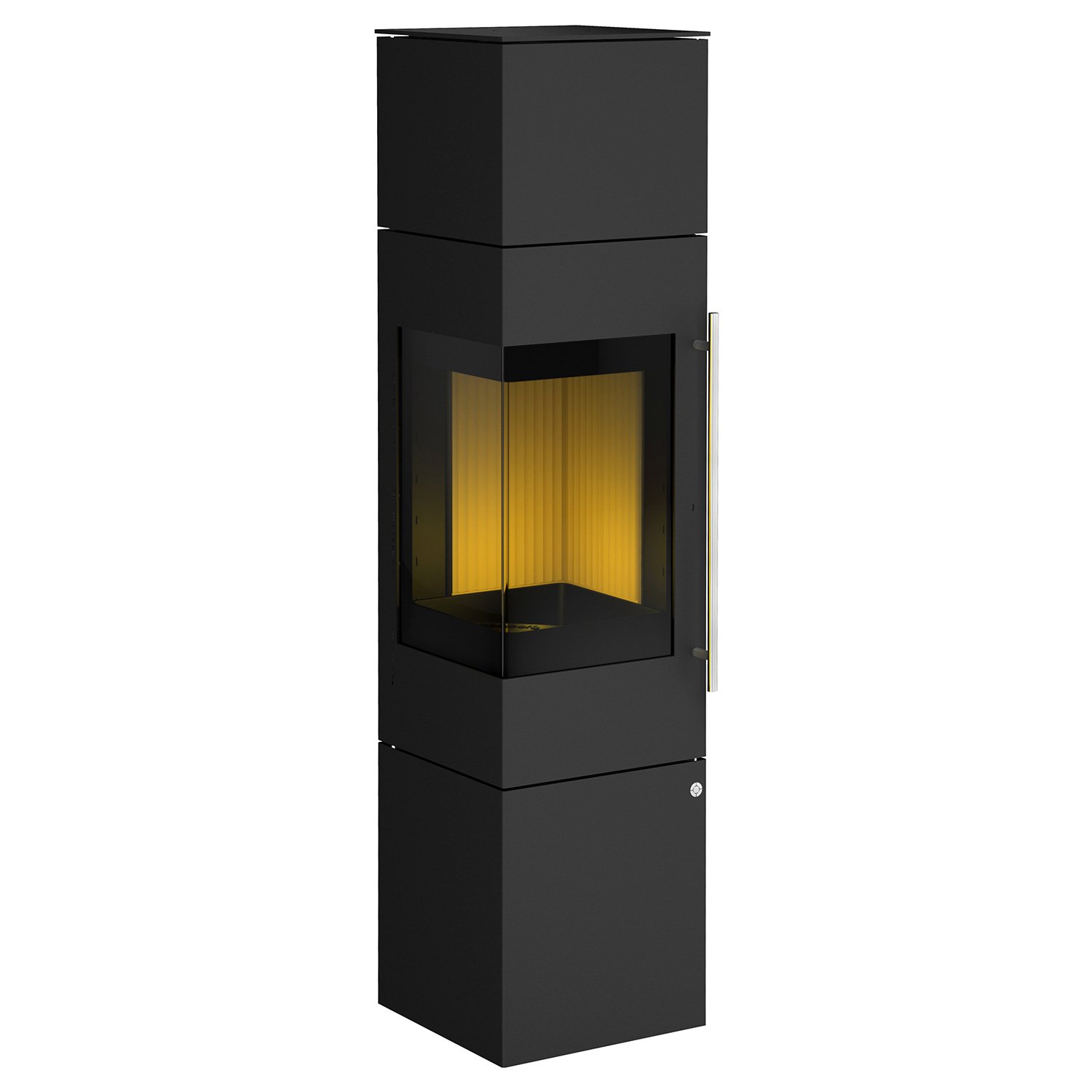 Die elegante Bauweise mit über Eck verlaufender Panoramascheibe sorgt für einen extrabreiten Blick auf das Feuer.