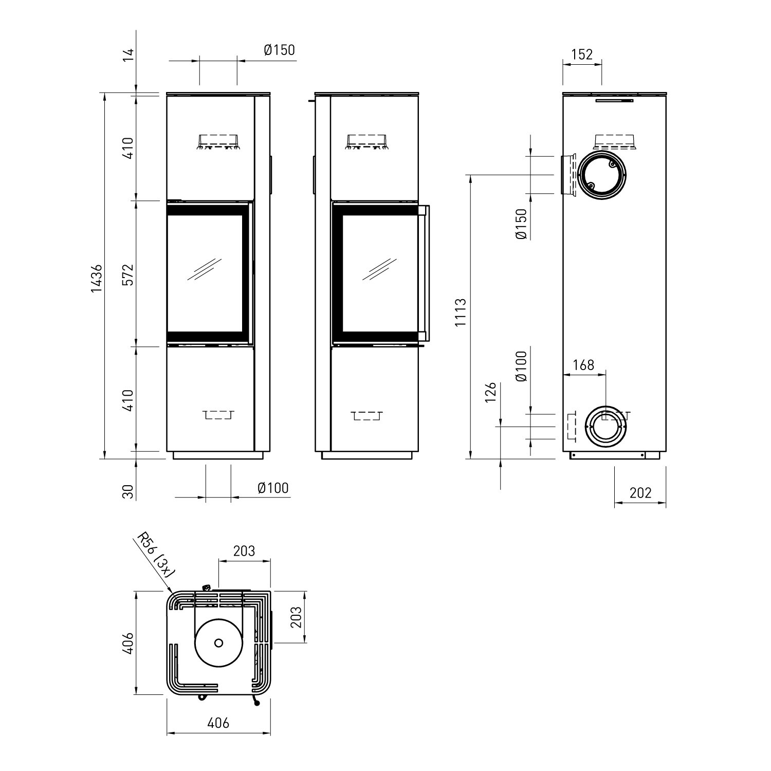 Rauchrohranschluss: 150 mm (oben/hinten)