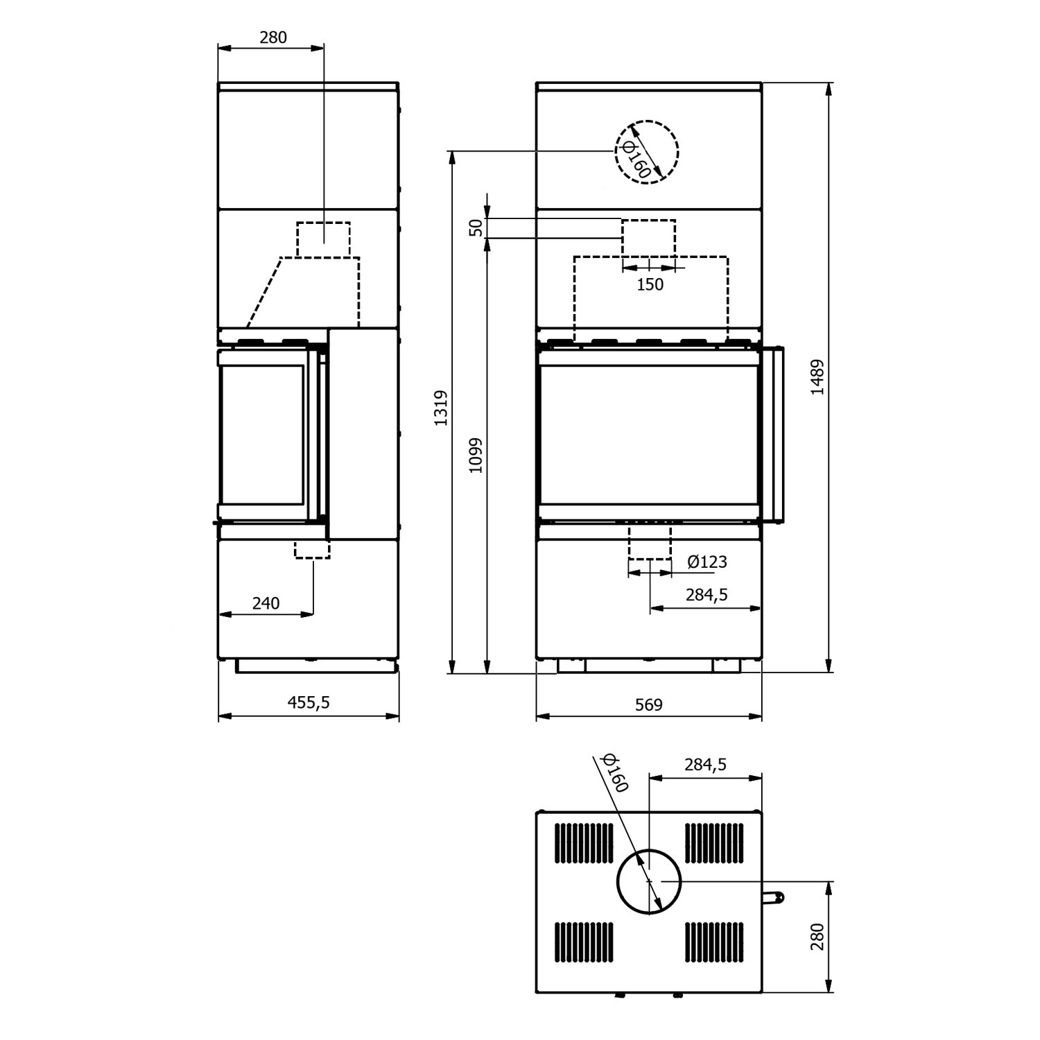 Rauchrohr: Ø 150 mm (oben/hinten)