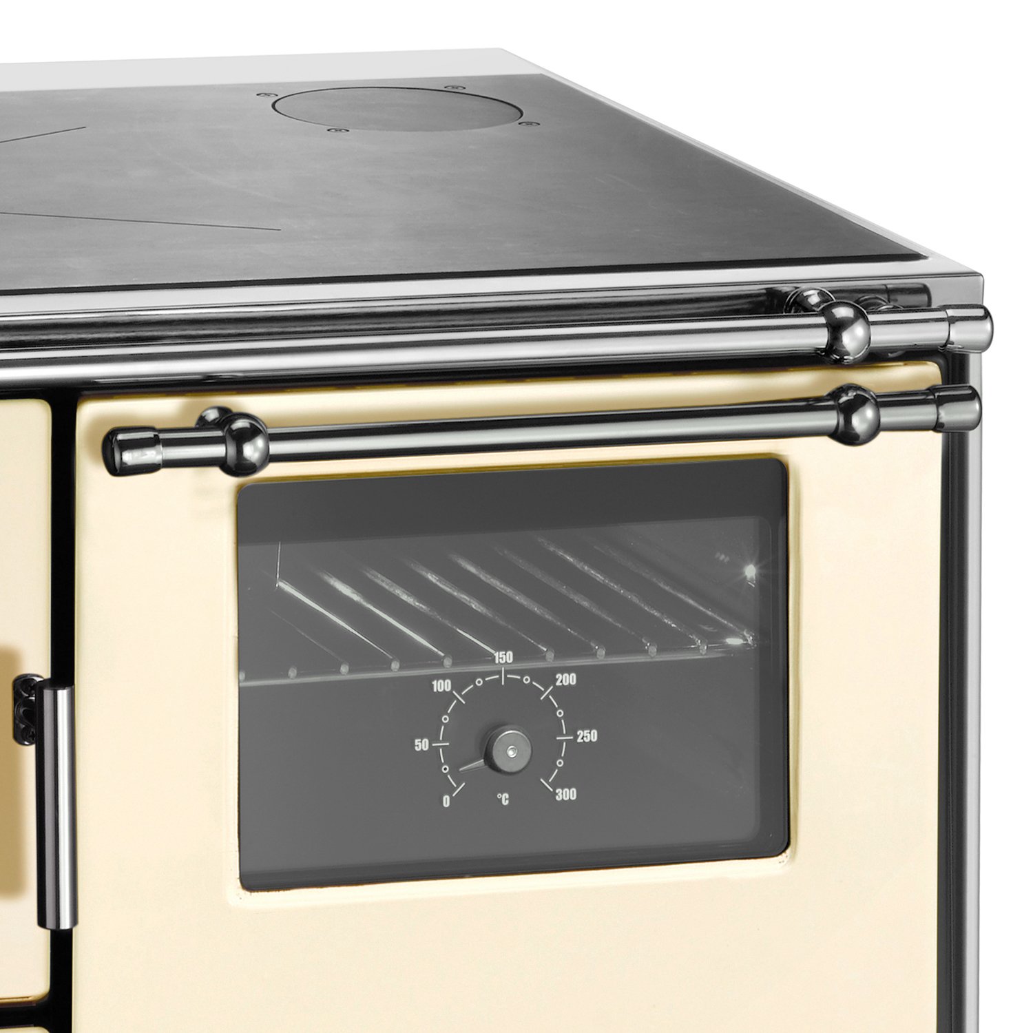 Das große Backfach ist mit einer Doppelverglasung und einem integrierten Thermometer ausgestattet, sodass Sie die Backtemperatur bequem im Blick behalten. Das Sichtfenster in der Brennraumtür bietet freie Sicht auf das lebendige Flammenspiel und sorgt für ein warmes, gemütliches Ambiente in Ihrer Küche.