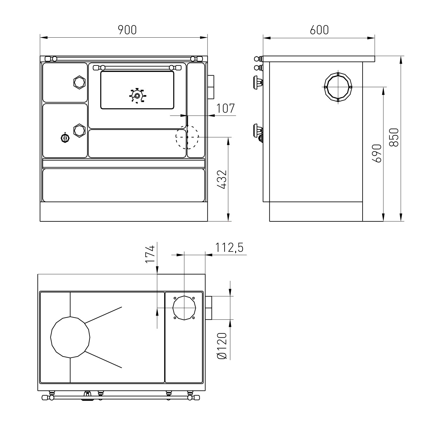 Mit mehreren Rauchrohranschlüssen – hinten, oben oder seitlich links/rechts – lässt sich der Küchenofen flexibel an nahezu jeden Aufstellort anpassen. Über das Variantenmenü wählen Sie bequem, ob sich das Backfach links oder rechts befinden soll und in welcher Emaille-Farbe der Ofen geliefert wird.