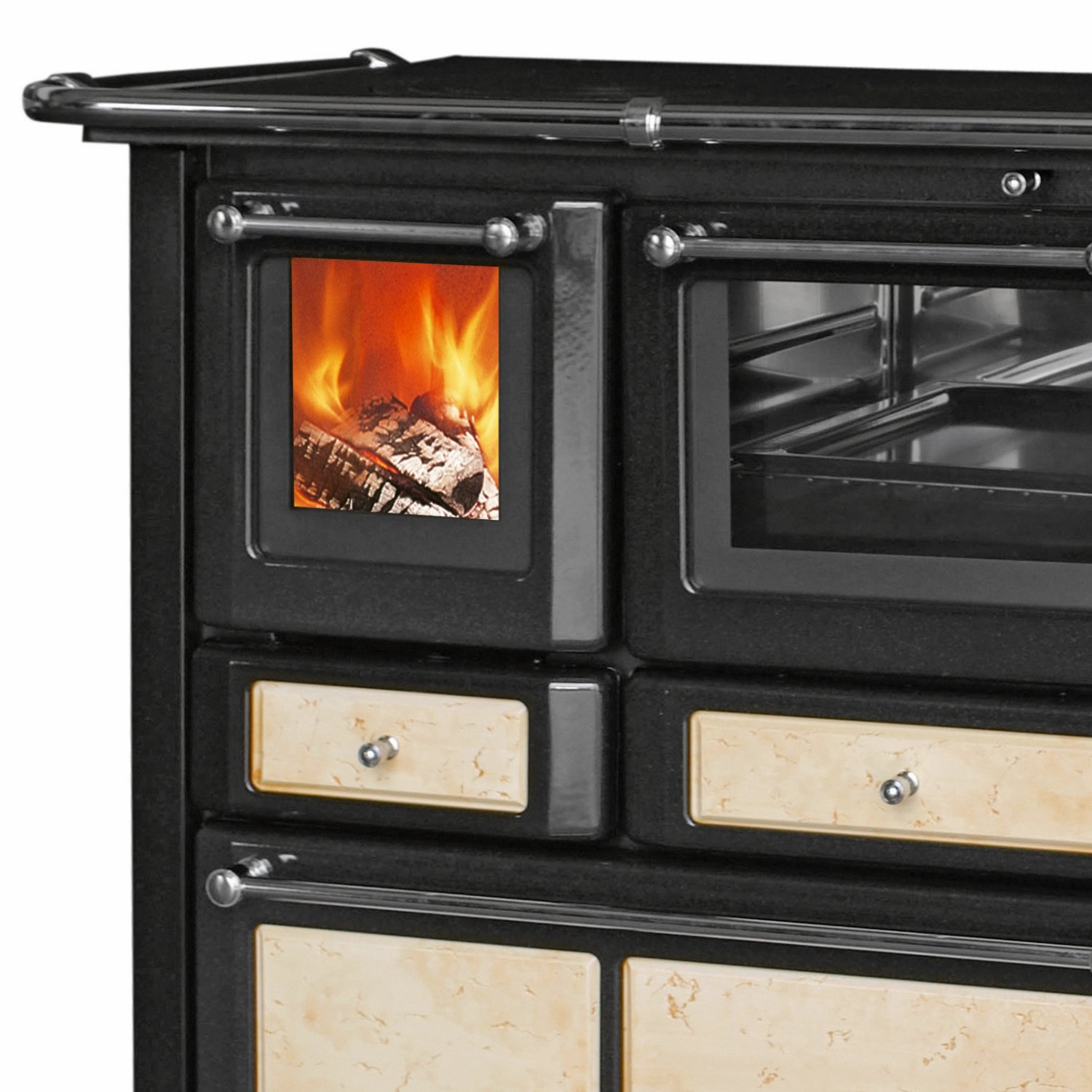 Durch das Sichtfenster in der Brennraumtür genießen Sie den Blick auf die lodernden Flammen – ideal für eine gemütliche Atmosphäre. Die Brennkammer kann mit Scheitholz bis 30 cm oder Briketts betrieben werden. Das Backfach rechts verfügt über ein integriertes Thermometer, sodass Sie die Temperatur jederzeit im Blick behalten. Backblech und Bratrost sind im Lieferumfang enthalten, damit Sie sofort loslegen können.
