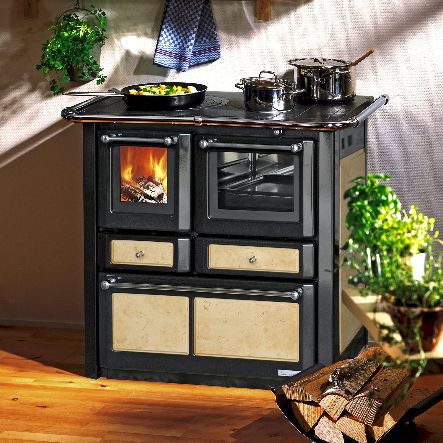 Erleben Sie uriges Landhausflair mit dem Westminster K 85 F Küchenofen mit Backfach rechts, einem traditionellen Holzherd von hoher Qualität. Die robuste lackierte Gusskochplatte mit integrierten Kochringen ermöglicht klassisches Kochen wie früher und bietet zugleich hohe Langlebigkeit. Die umlaufende Herdstange dient als praktischer Platz zum Trocknen und Aufbewahren von Geschirrtüchern.