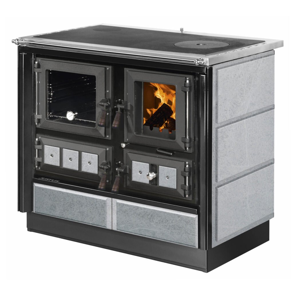 Justus Rustico-90 2.0 – 7 kW Küchenofen Schwarz mit Backfach & Edelstahl-Kochfeldrahmen